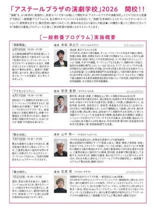 “演劇”を、より体系的・実践的に、長期スパンで学べる場として開校する「アステールプラザの演劇学校」。1コマ(1日)から受講が可能な[一般教養プログラム]は、各分野のスペシャリストをお招きして、“演劇”を多角的にとらえていくレクチャー&ワークショップ。表現者を志す方、舞台芸術に触れてみたい方、興味のある方なら皆さん大歓迎★この機会に奮ってご参加ください!!
